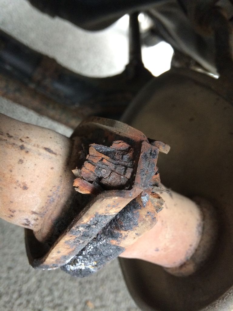 運転席のすぐ後ろ側にあるボディマウント部も錆びて割れている・・・