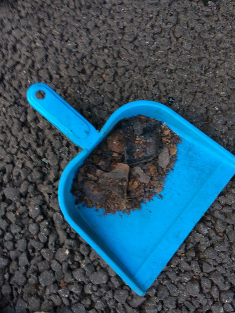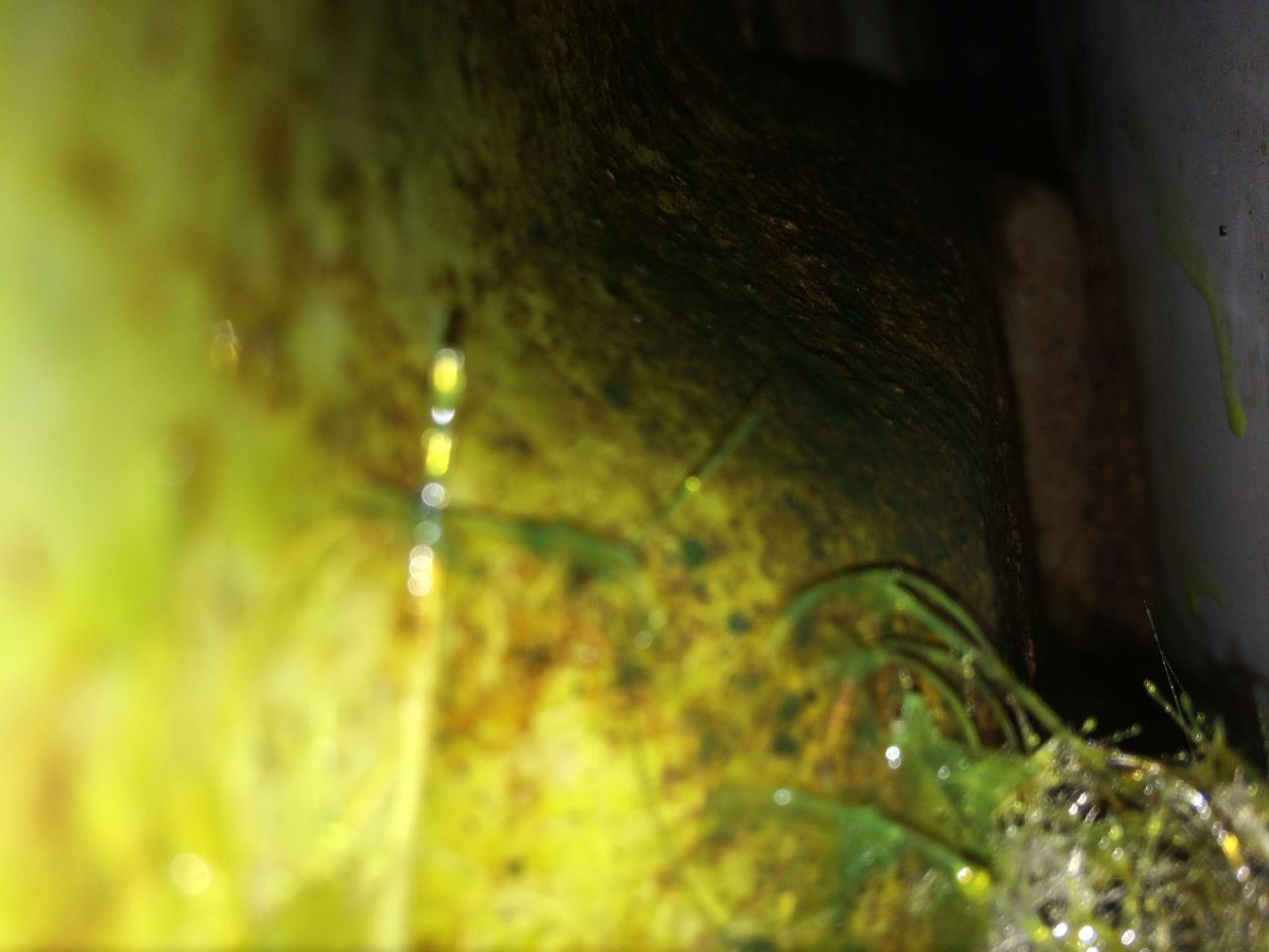 フレーム内部はホースの先に100均のトイレ掃除用のブラシをくっつけて汚れをかき出します。すると出るわ出るわ、錆がいつまでも出てきます。写真に写っているのはごく一部で、水抜き穴から出ないくらいの大きさの錆の塊が内部に大量に堆積していました・・・錆が水抜き穴を塞いでさらに錆を誘発していたようです。