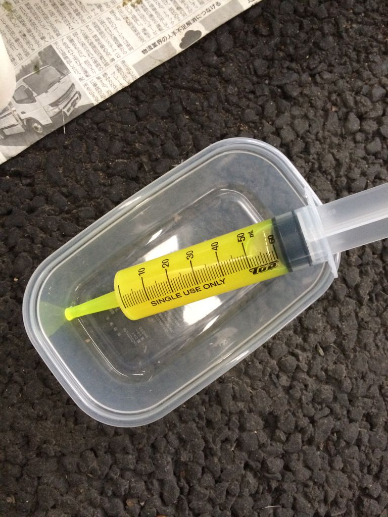 ラストボンドをフレーム内部を満たせるくらいの量を買うと、ちゃんとしたジムニーが買えるくらいの金額になってしますので、ホースを付けたシリンジでなるべく広範囲にラストボンドを注入し、ホースや園芸用の支柱を取り付けた柄付きブラシでフレーム内部に塗り広げる作戦で行くことにしました。
