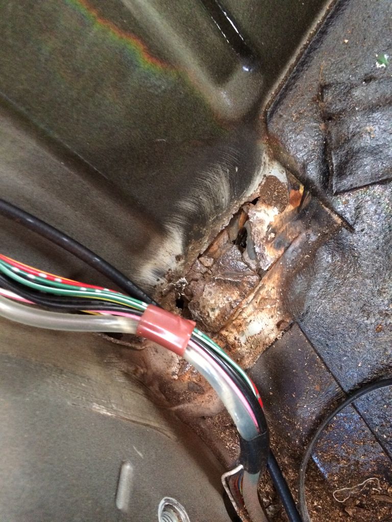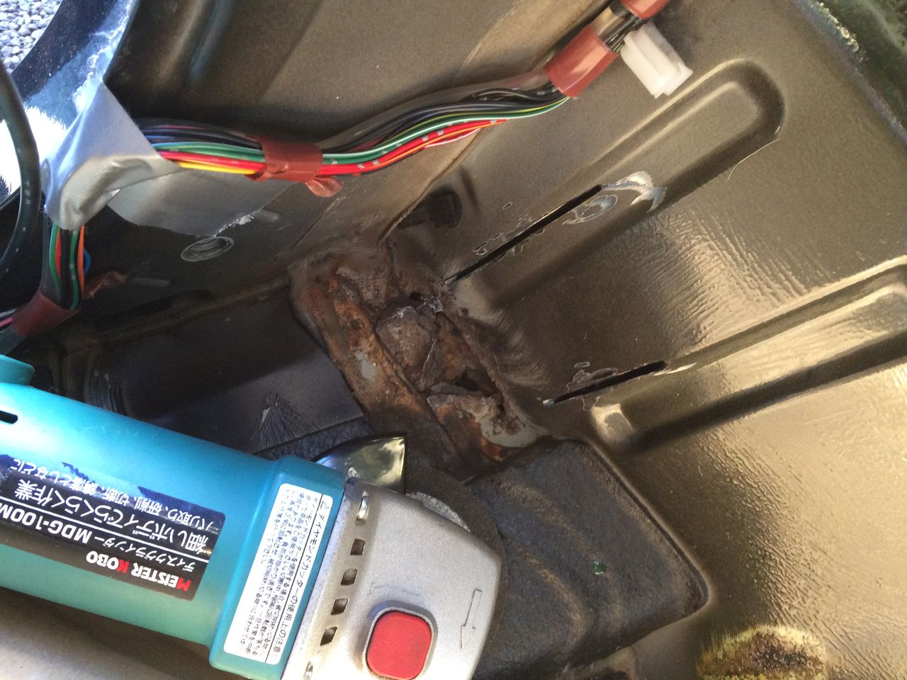 そして、ボディの錆で一番気になっていた、運転席後部のボディマウント部の錆をどうにかして対策しようと運転席後部のカーペットをめくるとひと際錆が酷い箇所を発見しました。