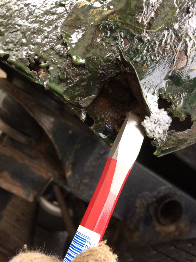 錆を掻き出すとここだけでこの量です。ボディマウントはもはやスカスカで全くボディを支えていません。どうやって補修しようか途方にくれます・・・(補修方法は後で書きます。)