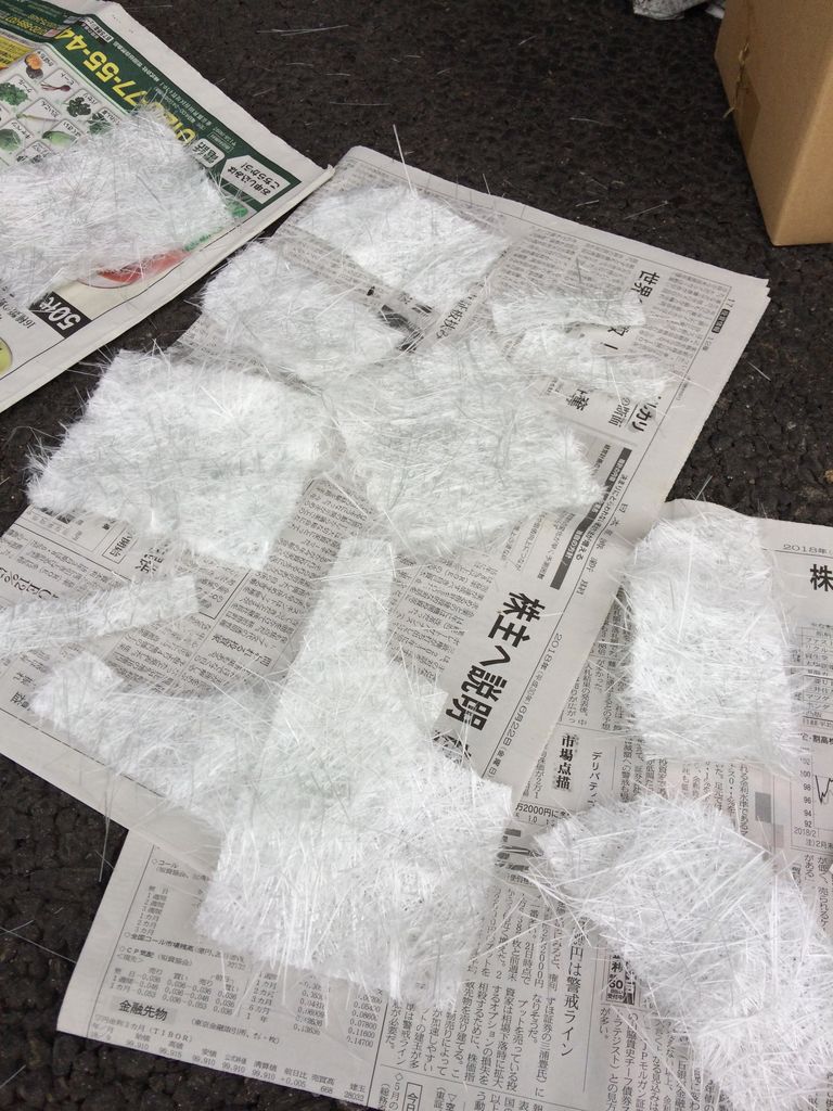まずは、ガラス繊維マットを紙型に沿って切り出していきます。上下2枚ずつ用意しなければいけないので、これが一番大変な作業でした。切り出したガラス繊維マットはしっかりともみほぐしておきます。そうすることで樹脂の浸透を高め、良く密着するようになります。FRPの施工は硬化するまでの時間との闘いですので、下準備が重要になります。