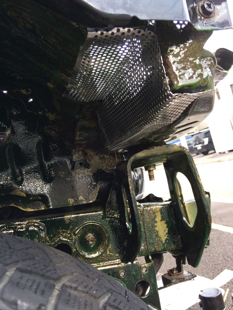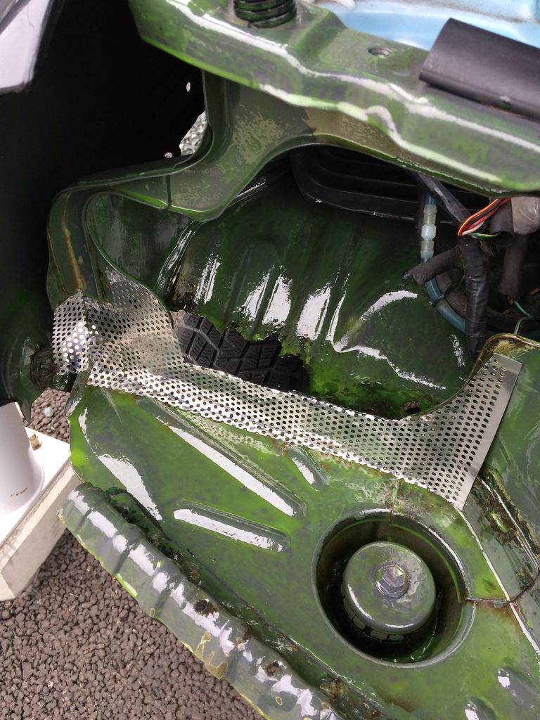 ↑ヘッドライト取り付け用の穴も開けました。金属用のドリルの歯が高かったので、木工用の12mmのドリルで開けましたが余裕でした。黄緑になっているのは、余ったラストボンドを塗ったからです。