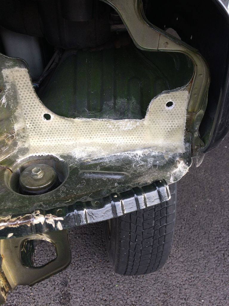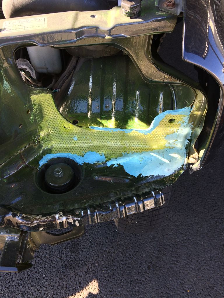 FRPが硬化したら、余分な部分を切り取って隙間などをパテで埋めていきます。隙間が空いていると水が入り込み、錆を再発させる原因になりますので丁寧に行いました。