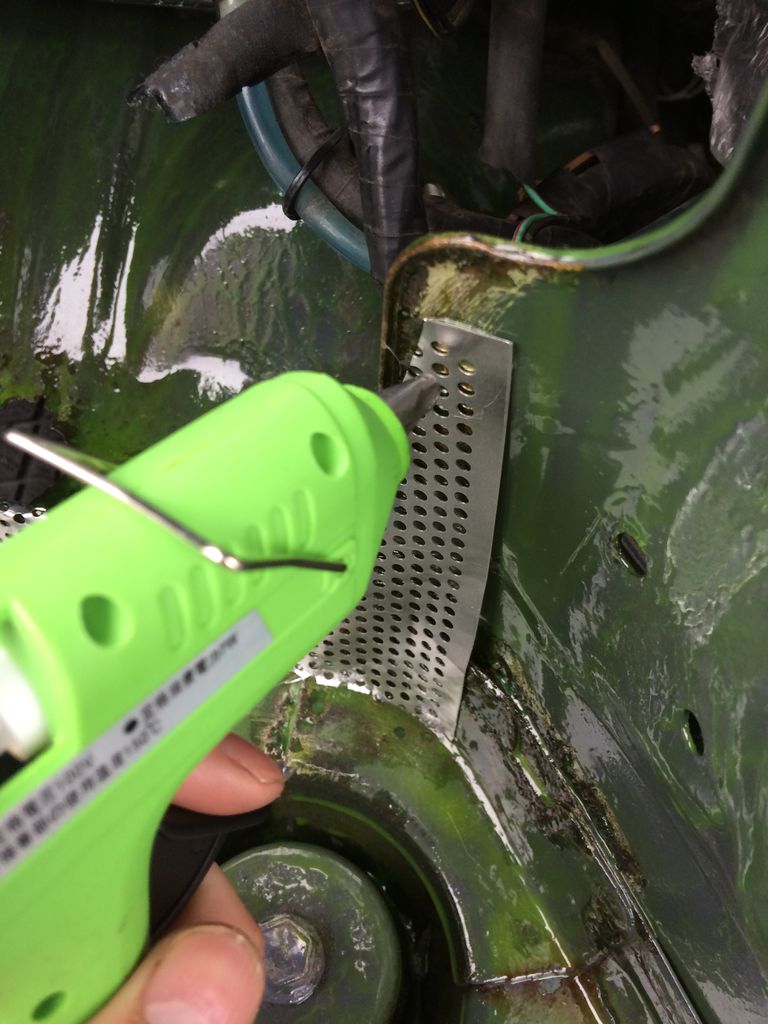 溶接は一切行わず、アルミパンチング板の固定はグルーガン(ホットボンド)で行っています。