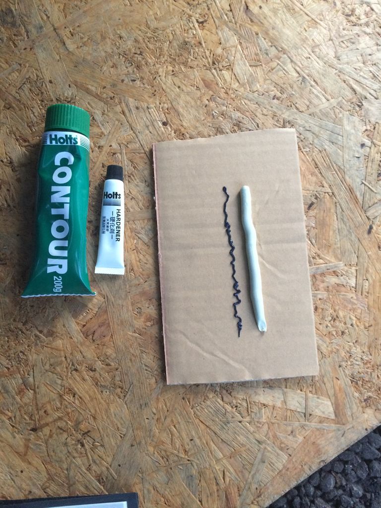 リアマフラー上部や細かい穴もすべて塞ぎました。硬化した部分を触ってみるとかなり強度があり、叩いてみると金属のようなコンコンという音がします。リアマフラー上部はこれでもかというくらい樹脂を流し込みましたので、体重をかけてもびくともしません。