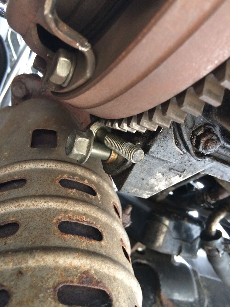 エンジン側にちょうど良い穴が開いているので、そことフライホイールにボルトを2本かけて回り止めをします。