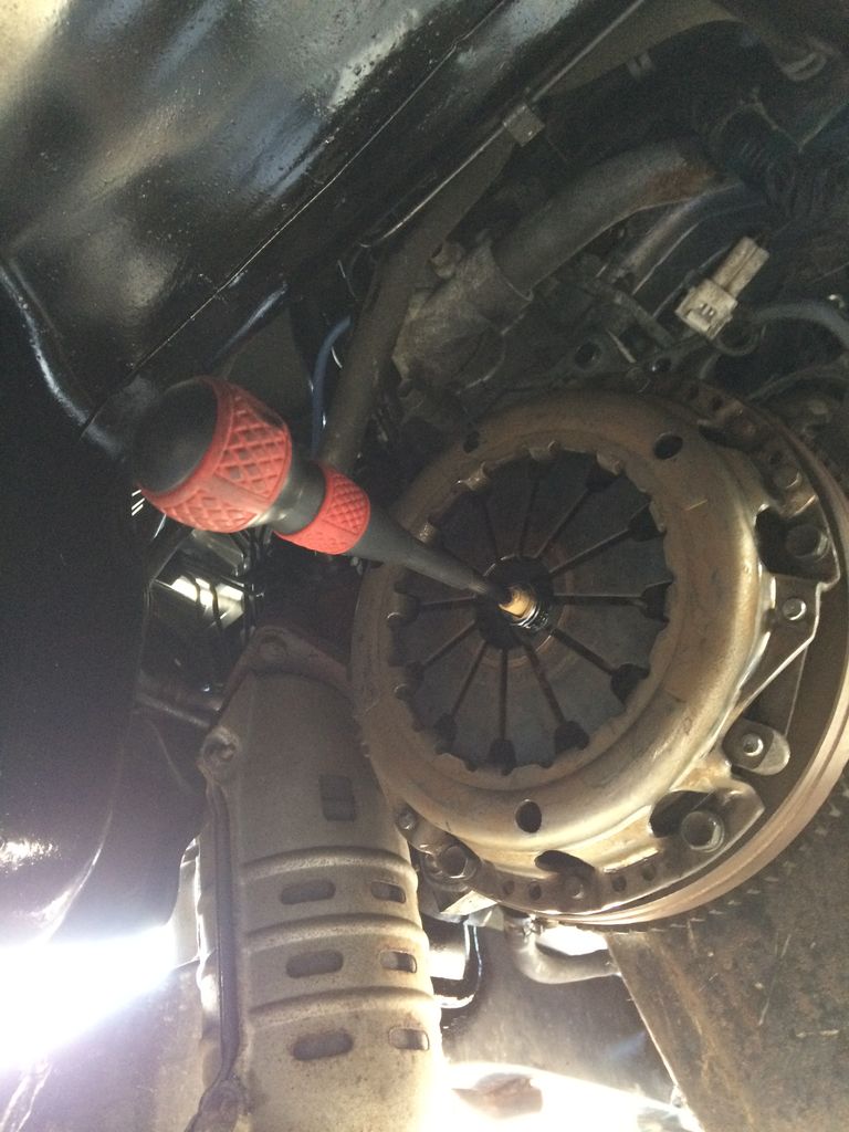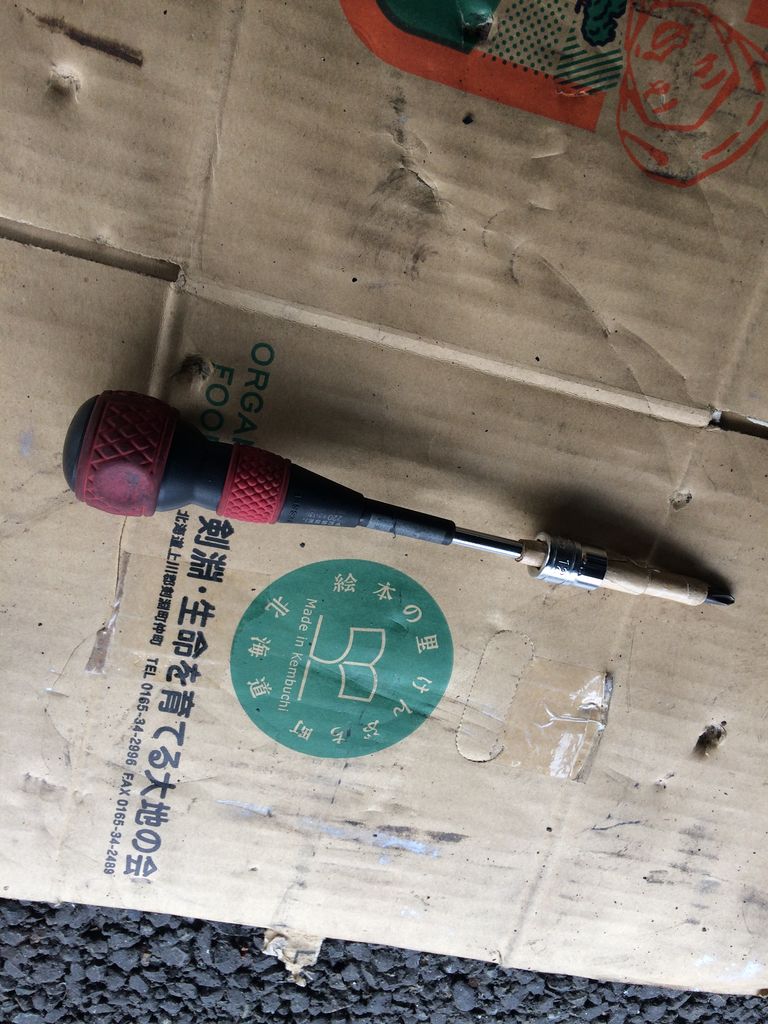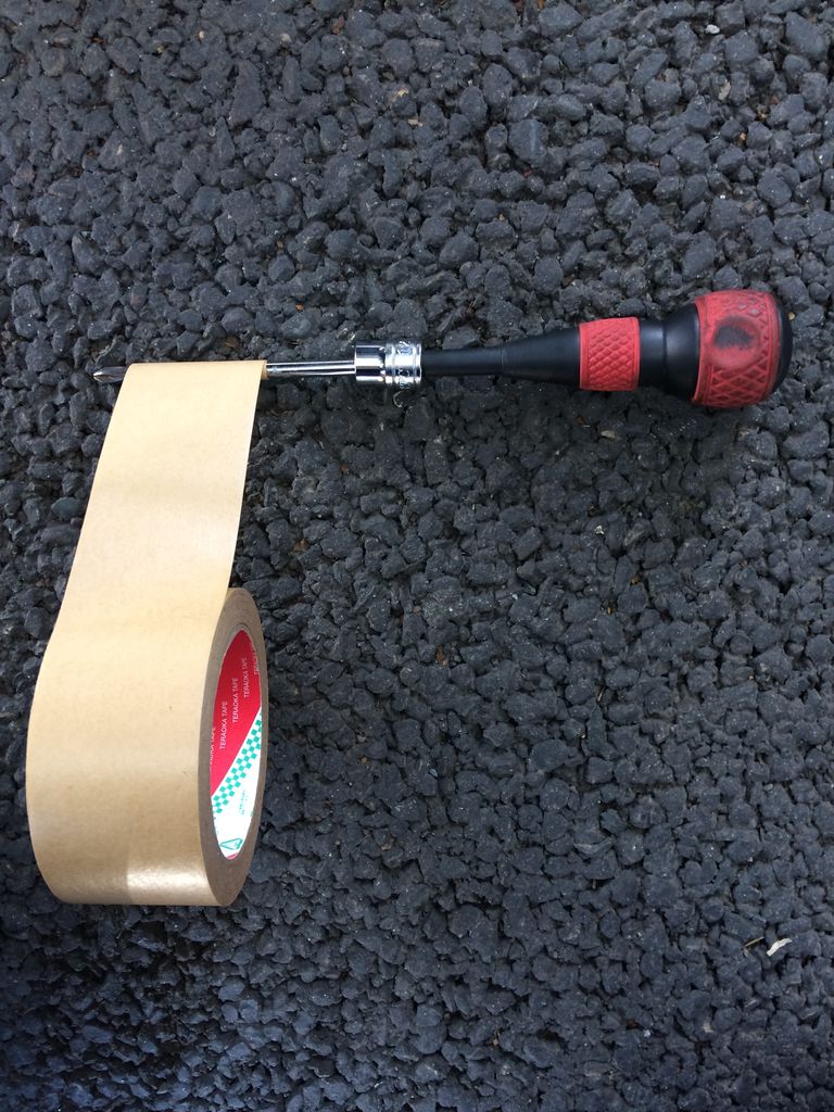 お金持ちは芯出し用の工具を使いますが、貧乏人は知恵を絞り出すしかありません。色々試してみたところ、クラッチディスクの穴は12mmのソケットがぴったりでしたので、ドライバーに12mmのソケットを差し込み、ガムテープをぐるぐる巻きにして微調整を繰り返して芯出し用ツールを自作しました。
