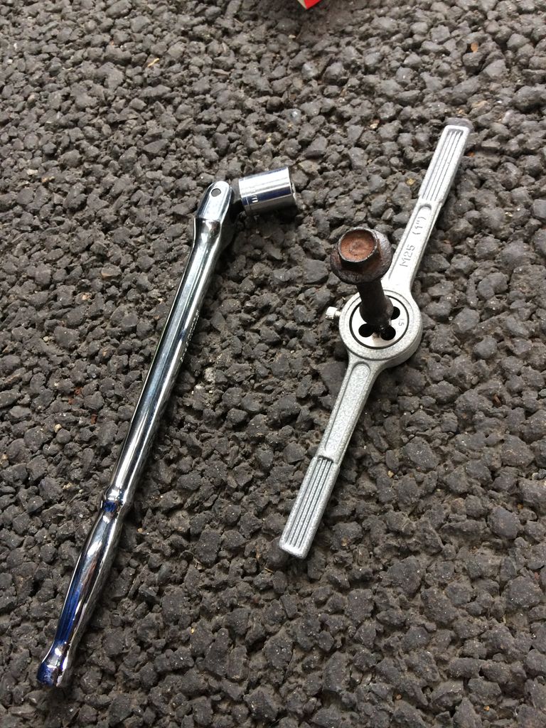 最後に錆びてボロボロになっていたマフラー取り付けボルトをダイスできれいにします。