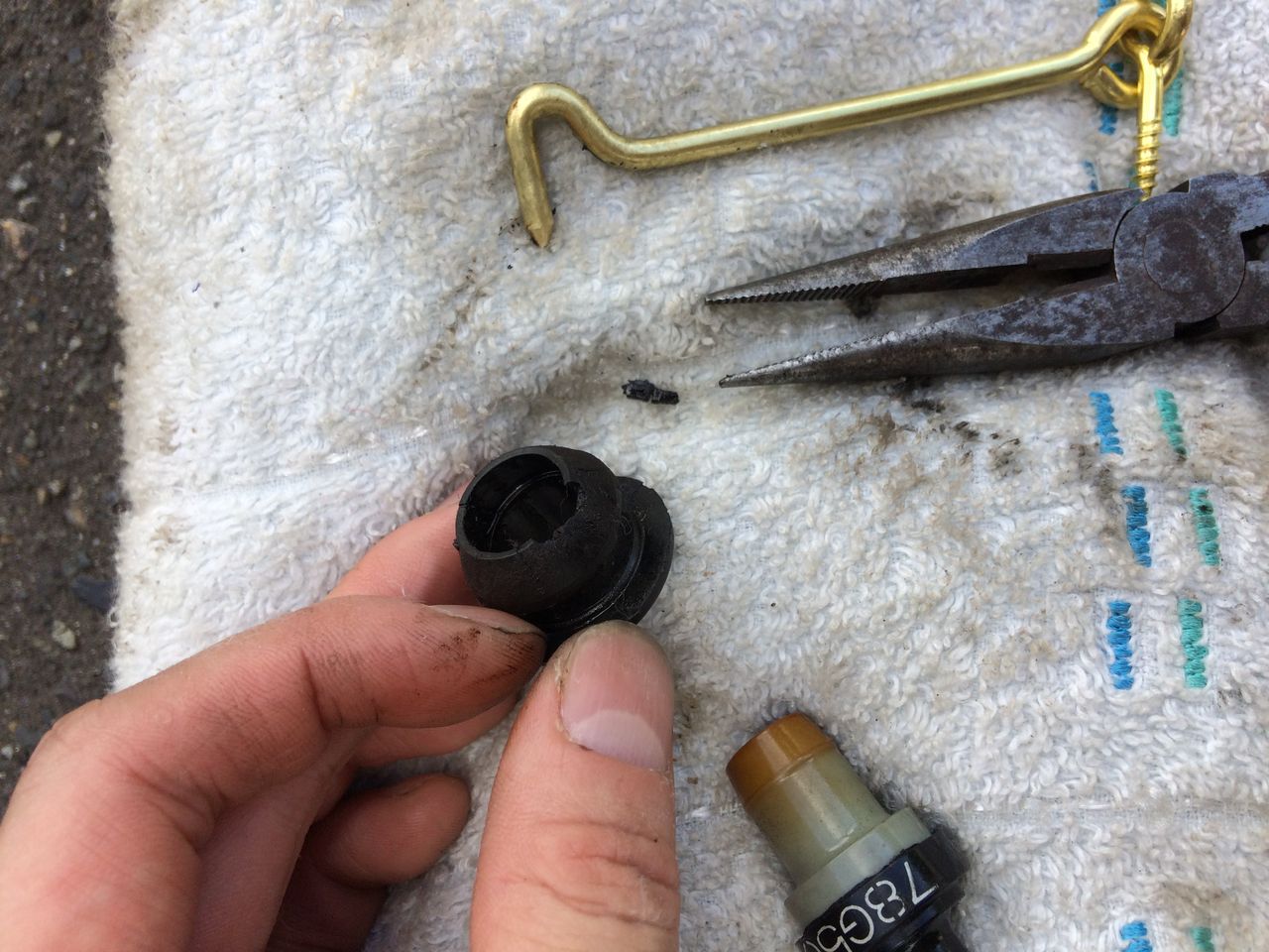 次にPCVバルブシールを取り外します。がっちりはまって硬化していますので、フック状のもので内側から外側に向かって引っ張り出した方が良いです。ドライバーなどで外側から内側にこじるとヘッドカバー内にシールそのものや破片が落ちてしまう危険性があります。自分は扉に付けるアオリ止めがたまたま手元にあったのでそれを使いました。