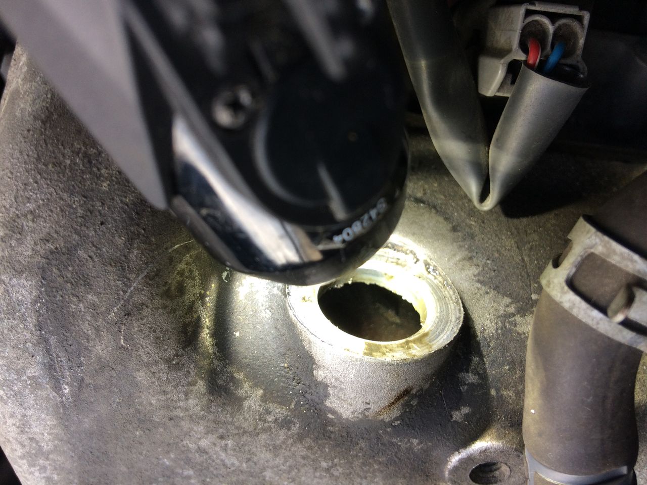 ヘッドカバー内をライトで照らして落とした破片を探します。幸いすぐ近くにありましたので何とか摘出することができました。