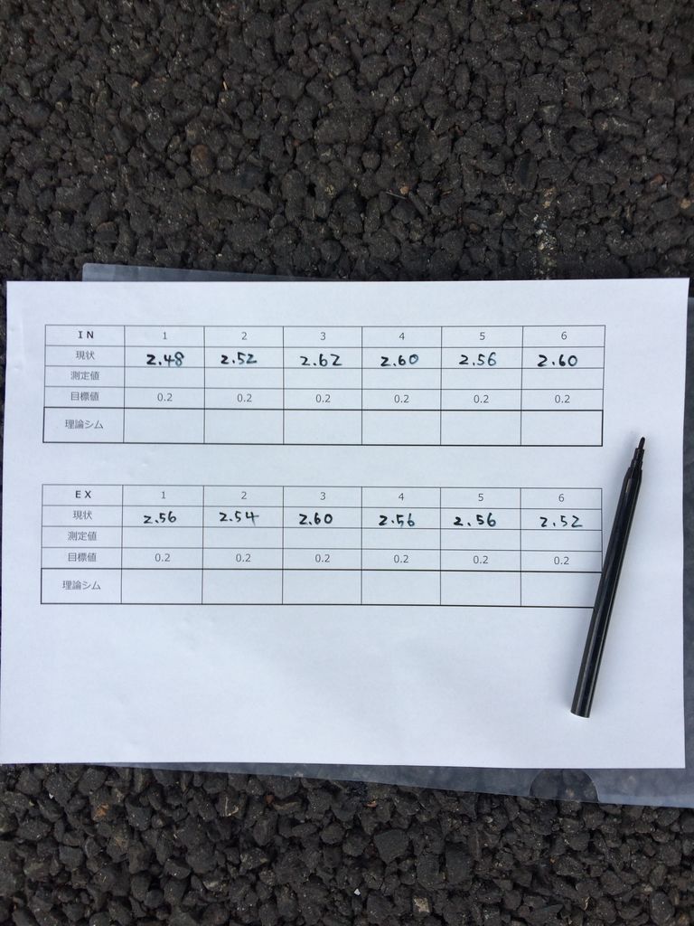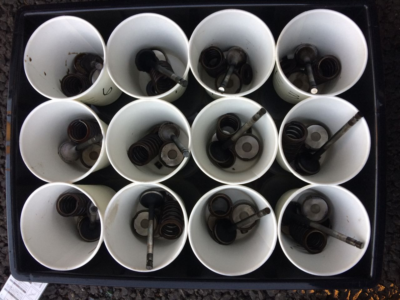 ↑上の写真のように紙コップにどの場所か書いて保管すると便利ですが、このまま洗浄液を入れると文字が消えてしまします・・・シムには厚みを示す番号が刻印されていますので、紙に書いておくのが間違いないと思います。どうせタペット調整の際にあーでもないこーでもないと紙に書いた数字を入れ替えていく作業があるので、面倒臭がらずに下の写真のように先に整理してしまいましょう。
