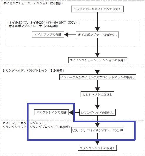 今回はバルブとピストンの取り外しについて書いていきます。エンジン分解整備の取り外し作業については今回が最後になります。フロー図でいうと下記の青い線で囲んだ部分になります。